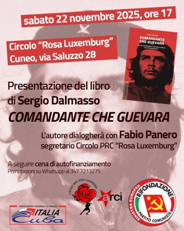 L’incontro è promosso da Rifondazione Comunista, dal Circolo ARCI Rosa Luxemburg e dall’Associazione Nazionale di Amicizia Italia-CubaSabato 22 novembre, alle ore 17, presso il Circolo “Rosa Luxemburg” di Cuneo, in via Saluzzo 28, Sergio Dalmasso presenterà il suo nuovo libro Comandante Che Guevara. La vita, le battaglie e il pensiero politico di un rivoluzionario. L’autore dialogherà con Fabio Panero, segretario del Circolo PRC “Rosa Luxemburg”. L’incontro è promosso da Rifondazione Comunista, dal Circolo ARCI Rosa Luxemburg e dall’Associazione Nazionale di Amicizia Italia-Cuba. A seguire cena di autofinanziamento. Si può prenotare su WhatsApp al numero 347 7213275.