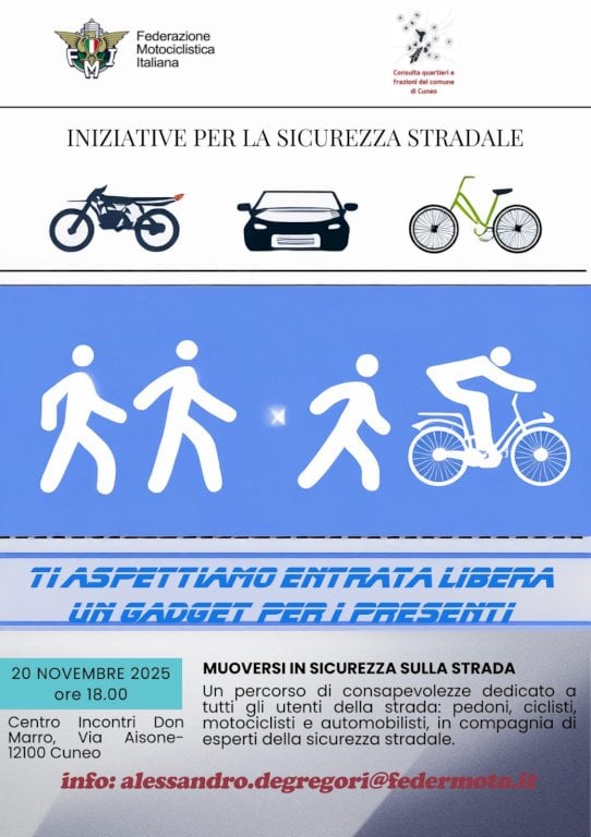 La manifestazione - dal carattere gratuito - si terrà a partire dalle 18 presso il Centro incontri don Marro di via Aisone 12100. “Sarà l’occasione per affrontare un percorso di consapevolezza - dichiara De Gregori - dedicato a tutti gli utenti della strada, pedoni, ciclisti, motociclisti e automobilisti, in compagnia di esperti e formatori della Fmi”. Nell’occasione sarà anche offerto un gadget.
