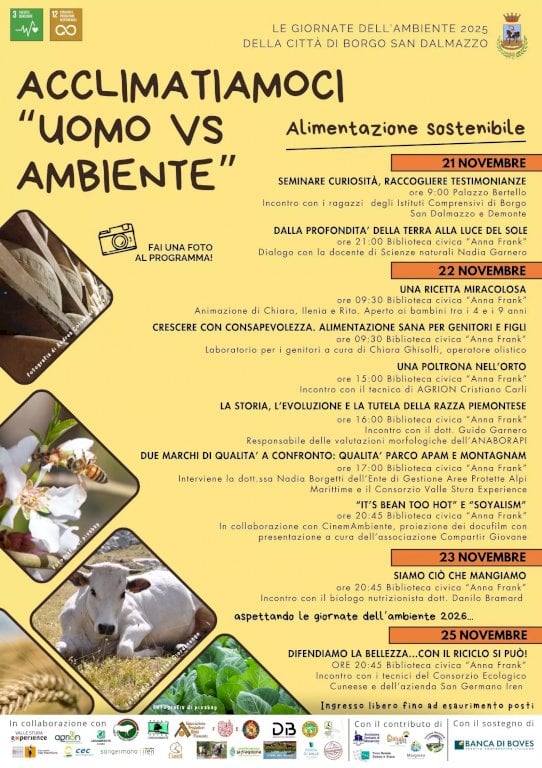 Un ciclo di incontri, laboratori, proiezioni e testimonianze con particolare attenzione al tema dell’alimentazione sostenibileDal 21 al 25 novembre, Borgo San Dalmazzo ospita le Giornate dell’Ambiente 2025, "Acclimatiamoci: Uomo vs Ambiente", un ciclo di incontri, laboratori, proiezioni e testimonianze con particolare attenzione al tema dell’alimentazione sostenibile. L’iniziativa si svolge principalmente presso la Biblioteca Civica “Anna Frank” e Palazzo Bertello, con ingresso libero fino a esaurimento posti.