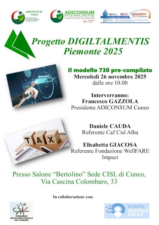 Durante il primo appuntamento, il 26 novembre, verrà presentato il funzionamento del 730 precompilato, illustrando come accedere al servizio e come utilizzarlo in autonomiaNell’ambito del progetto Digitalmentis, iniziativa promossa dal MIMIT – Ministero delle Imprese e del Made in Italy e gestita dalla Regione Piemonte in collaborazione con le associazioni dei consumatori, Adiconsum Cuneo organizza tre appuntamenti gratuiti rivolti alla cittadinanza.
