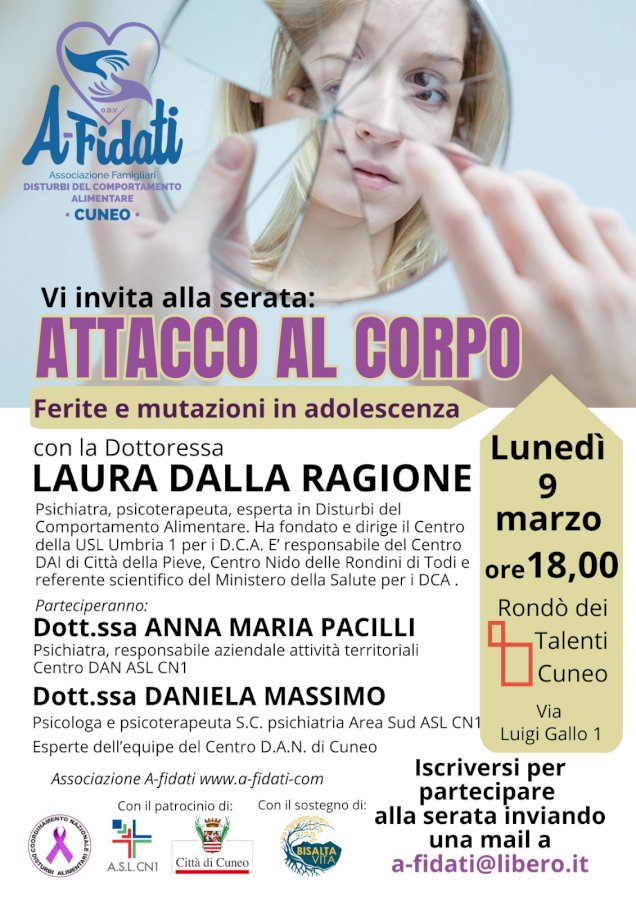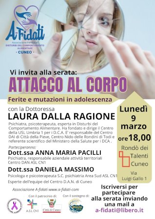 Rondò dei Talenti (9 marzo), Ipercoop di Cuneo (dal 12 al 22 marzo), Sala Varco (13 marzo), ore 18 (9 marzo), 17.30 (dal 12 al 22 marzo), 20.45 (13 marzo) disturbi alimentari - prevenzione - A-fidati - Laura Dalla Ragione