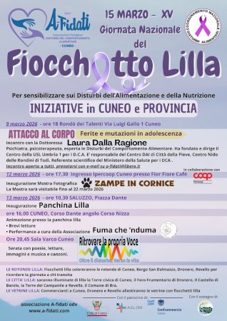 A Cuneo l'associazione A-Fidati presenta una rassegna di eventi per sensibilizzare sul tema e promuovere la prevenzioneIl 15 marzo si celebra la XV Giornata Nazionale del Fiocchetto Lilla, dedicata alla sensibilizzazione sui Disturbi dell’Alimentazione e della Nutrizione (DAN). Anche quest’anno l’associazione A-Fidati, nata da genitori di ragazzi affetti da disturbi alimentari, promuove a Cuneo e nel territorio provinciale una serie di iniziative aperte al pubblico, con l’obiettivo di informare, creare consapevolezza e offrire occasioni di confronto su tematiche che coinvolgono sempre più famiglie, giovani e operatori.