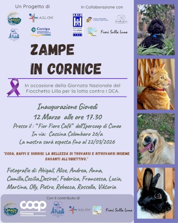 Giovedì 12 marzo alle 17.30, presso il Fior Fiore Café dell’Ipercoop di Cuneo (Cascina Colombaro 26/a), verrà inaugurata la mostra fotografica “Zampe in cornice”, dedicata al tema dei disturbi alimentari attraverso uno sguardo originale e simbolico.