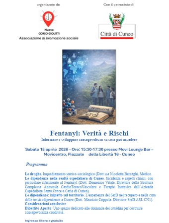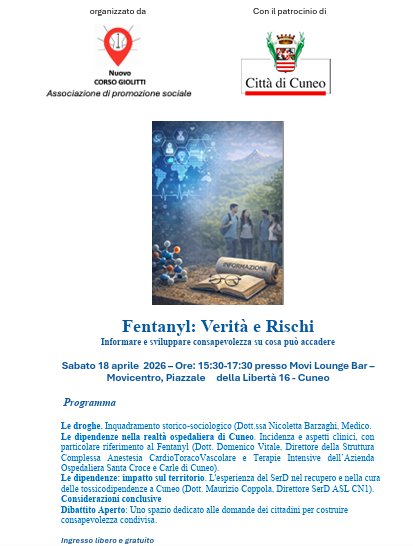 Appuntamento presso il Movicentro in data 18 aprile, dalle 15.30 fino alle 17.30. Ingresso libero, consigliata la prenotazioneL’APS Nuovo Corso Giolitti promuove sabato 18 aprile, dalle ore 15.30 alle 17.30, presso il Movi Lounge Bar del Movicentro di Cuneo, l’incontro pubblico “Fentanyl: Verità e Rischi”, aperto alla cittadinanza e a ingresso libero. L’iniziativa nasce con un obiettivo preciso: offrire un’informazione seria, comprensibile su una sostanza che, per caratteristiche ed effetti, merita oggi un’attenzione pubblica lucida e documentata.