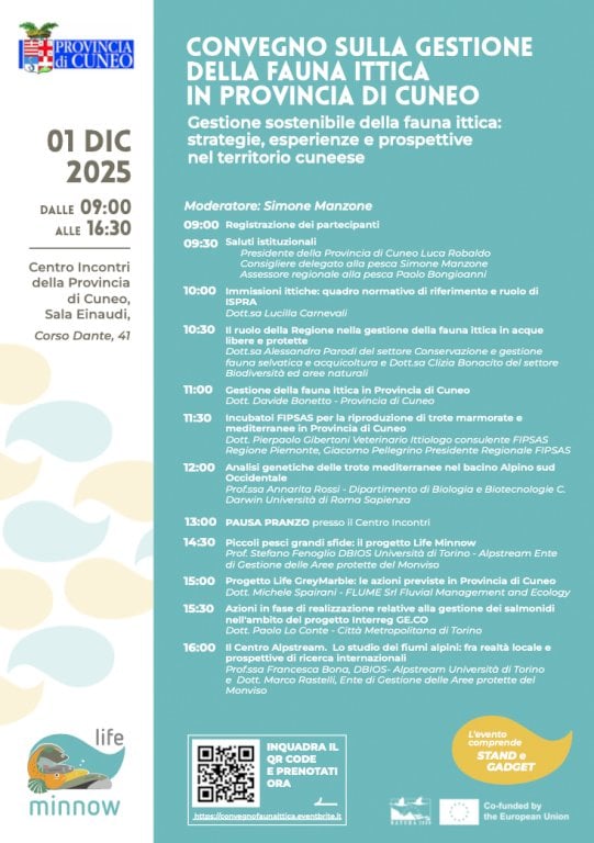 Il 1° dicembre, presso la Sala Einaudi del Centro Incontri della Provincia, un importante momento di confronto tra enti, associazioni e operatori del settoreLa Provincia di Cuneo, nell’ambito del progetto quinquennale “Life Minnow”, finanziato dall’Unione Europea nella sezione Life Nature and Biodiversity, organizza il convegno “Gestione sostenibile della fauna ittica: strategie, esperienze e prospettive nel territorio cuneese”, in programma lunedì 1° dicembre, dalle ore 9 alle 16.30, presso la Sala Einaudi del Centro Incontri della Provincia di Cuneo (Corso Dante 41, Cuneo).