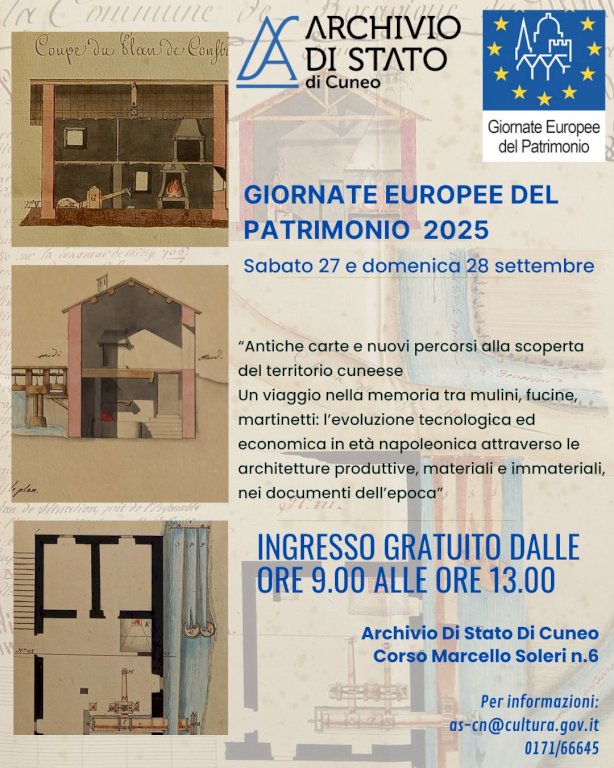 Sabato 27 e domenica 28, dalle 9 alle 13, sarà visitabile una mostra sulle evoluzioni tecnologiche del nostro territorio in età napoleonicaL'Archivio di Stato di Cuneo, aderendo alle Giornate europee del patrimonio (GEP), ha organizzato per i giorni sabato 27 e domenica 28 settembre, dalle ore 9 alle 13, una mostra documentaria intitolata: