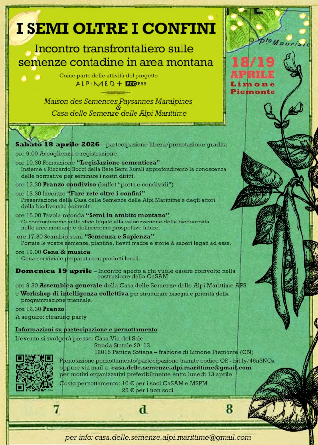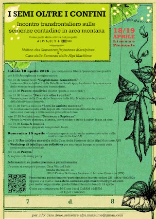 È una prima occasione di incontro e scambio di esperienze tra realtà piemontesi, liguri e francesi intorno alle pratiche ed ai saperi sulla gestione, diffusione ed adattabilità delle semenze contadine nelle aree montane e delle terre alte. I focus principali riguarderanno alcune tematiche - la conoscenza degli aspetti normativi intorno alla circolazione delle sementi tra le aziende agricole, anche in vista delle prossime nuove norme UE – il confronto tra esperienze concrete di gestione e riproduzione delle sementi – le modalità per consolidare forme di collaborazione tra i soggetti interessati. Anche alla luce dei possibili impatti delle nuove tecnologie genomiche nei confronti delle varietà tradizionali e locali.