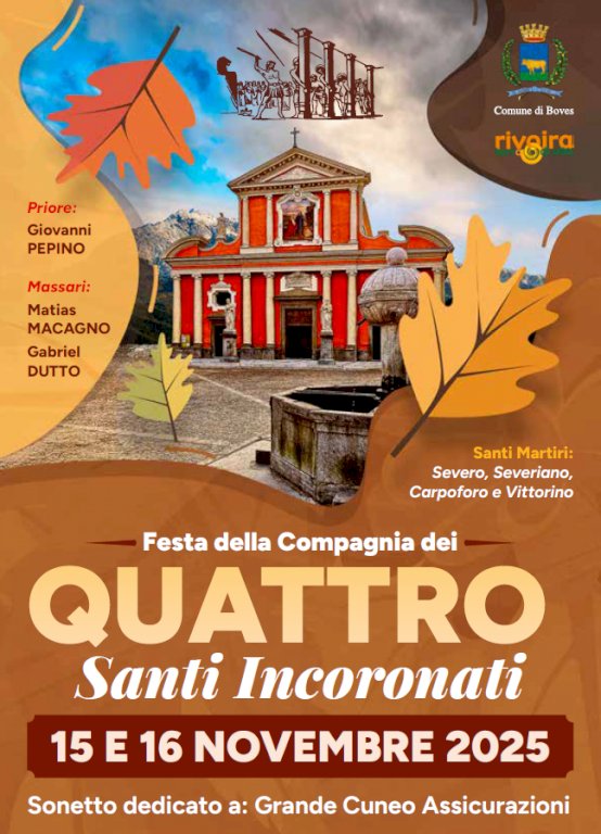 La domenica è previsto il raduno della Compagnia dei quattro Santi Incoronati, seguito dalla messa nella chiesa parrocchiale di San BartolomeoTorna anche quest’anno la grande festa dei muratori bovesani, sabato 15 e domenica 16 novembre presso il mercato dei fagioli. Il priore è Giovanni Pepino e i Massari Matias Macagno e Gabriel Dutto.