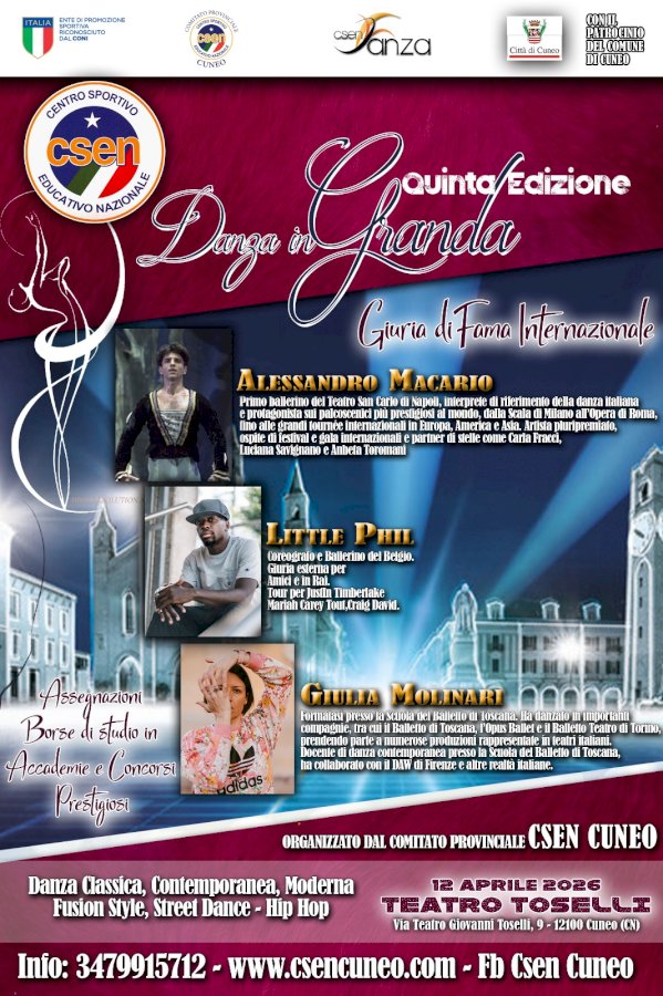 Domenica 12 aprile a Cuneo una giuria composta da Giulia Molinari, Alessandro Macario e Little Phill assegnerà ai partecipanti diverse borse di studioI giudici del concorso organizzato dal comitato provinciale CSEN Cuneo in collaborazione con il settore nazionale CSEN saranno: