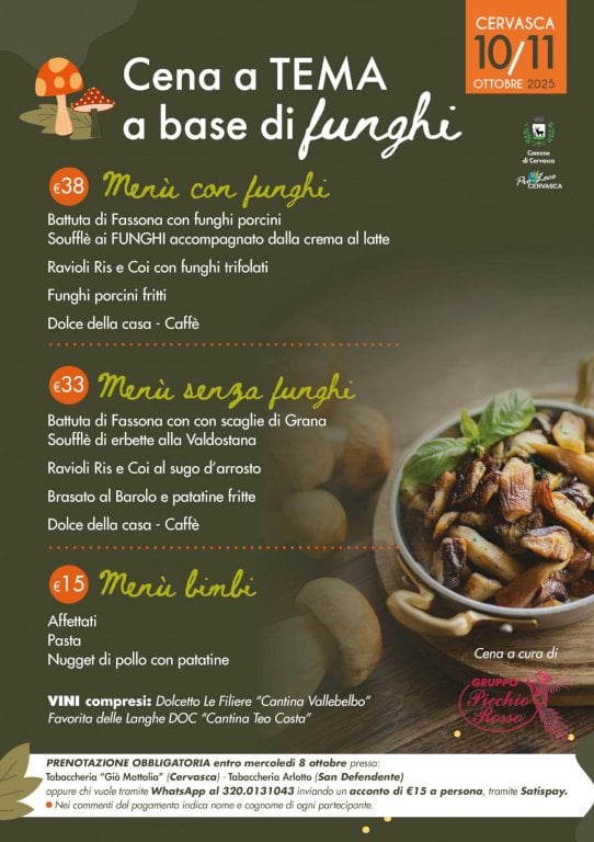 La prenotazione è obbligatoria entro mercoledì 8 ottobre presso: Tabaccheria “Giò Mattalia” (Cervasca) - Tabaccheria Arlotto (San Defendente) oppure per chi vuole tramite WhatsApp al 320.0131043 inviando un acconto di 15 euro a persona, tramite Satispay. Nei commenti del pagamento è necessario indicare il nome e il cognome di ogni partecipante.