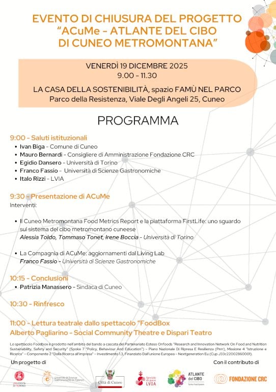 Venerdì la mattinata si aprirà con i saluti istituzionali dei partner che hanno accompagnato il percorso, tra cui il Comune di Cuneo, la Fondazione CRC, l’Università di Torino, l’Università di Scienze Gastronomiche e la LVIA. A seguire verranno presentati i risultati del progetto: dal Cuneo Metromontana Food Metrics Report alla piattaforma FirstLife, strumenti che offrono una lettura aggiornata e condivisa del sistema del cibo metromontano. Saranno inoltre raccontati gli sviluppi della Compagnia di ACuMe e del Living Lab, lo spazio partecipato nato durante il progetto. Dopo le conclusioni della Sindaca Patrizia Manassero, l’incontro proseguirà con un rinfresco e si chiuderà con la lettura teatrale “FoodBox” di Alberto Pagliarino, un momento artistico dedicato ai temi del cibo e della sostenibilità, prodotto nell’ambito del bando a cascata del Partenariato Esteso Onfoods “Research and Innovation Network On Food and Nutrition Sustainability, Safety and Security” (Spoke 7 “Policy, Behaviour And Education”) – Piano Nazionale Di Ripresa E Resilienza (Pnrr), Missione 4 “Istruzione e Ricerca” – Componente 2 “Dalla Ricerca all’impresa” – Investimento 1.3, Finanziato Dall’unione Europea – Nextgeneration Eu.