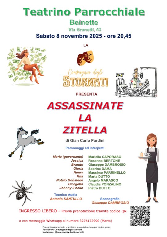 Sabato 8 novembre la “Compagnia degli Stornati” porta al Teatrino parrocchiale uno spettacolo a titolo totalmente gratuito con l’obiettivo di far ridere la genteSabato 8 novembre, alle ore 20.45, presso il Teatrino parrocchiale di Beinette, in via Granetti 43, la “Compagnia degli Stornati”, presenta la frizzante commedia in tre atti “Assassinate la zitella” di Gian Carlo Pardini.
