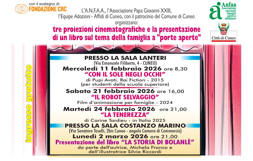 Per promuovere queste opportunità l’associazione ANFAA (Associazione Nazionale Famiglie Adottive Affidatarie) organizza “La famiglia a porte aperte”, una rassegna cinematografica con tre diverse proiezioni che si concluderà con la presentazione del libro “La storia di Bolanlè” di Michela Franco. Il linguaggio cinematografico è stato scelto come “registro altro” per raggiungere una cerchia sempre più ampia della popolazione.