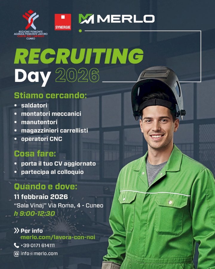 Il "Recruiting Day" organizzato dall'azienda, alla ricerca di saldatori, montatori, manutentori e magazzinieriLa Merlo organizza il "Recruiting Day 2026", una giornata dedicata alla selezione di nuove figure professionali da inserire nel proprio organico. L’evento si svolgerà mercoledì 11 febbraio, dalle 9 alle 12.30, presso la Sala Vinaj, in via Roma 4 a Cuneo. L’iniziativa è promossa in collaborazione con Regione Piemonte – Agenzia Piemonte Lavoro (Centri per l’Impiego) e Synergie, con l’obiettivo di favorire l’incontro tra azienda e candidati, valorizzando le competenze presenti sul territorio e creando nuove opportunità occupazionali. Durante la giornata, Merlo selezionerà diverse figure tecniche e operative strategiche per il rafforzamento, in particolare, dei reparti produttivi.