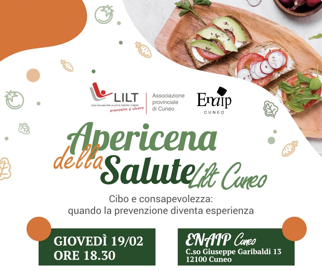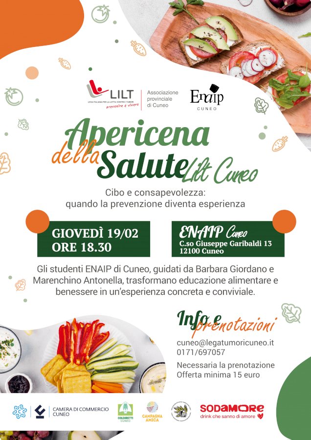 Nuovo evento dedicato alla prevenzione: l'incontro si terrà nell'istituto scolastico giovedì 19 febbraio alle ore 18.30La LILT Cuneo propone un nuovo appuntamento dedicato a salute e prevenzione, pensato per coinvolgere anche le nuove generazioni con un linguaggio concreto, esperienziale e vicino ai loro interessi. L’Apericena della Salute, in programma alle ore 18.30 di giovedì 19 febbraio, nasce dalla collaborazione con gli studenti di Enaip Cuneo (Corso Garibaldi), protagonisti di un percorso formativo che ha unito educazione alimentare e benessere psicologico. Nelle settimane precedenti, i ragazzi hanno partecipato a incontri guidati dalla nutrizionista Barbara Giordano e dalla psicologa Antonella Marenchino, approfondendo il legame tra alimentazione, emozioni, stili di vita e prevenzione. Da questo lavoro è nato un apericena tematico, ideato e realizzato dagli studenti come sintesi pratica delle conoscenze acquisite.