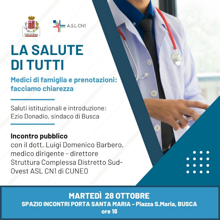 La serata del 28 ottobre sarà dedicata a informare la cittadinanza sulla situazione attuale dell’assistenza sanitaria di base e sull’accesso alle visite specialisticheIl Comune di Busca, in collaborazione con l’Asl CN1, organizza un incontro pubblico dal titolo “La salute di tutti – Medici di famiglia e prenotazioni: facciamo chiarezza”. La serata sarà dedicata a informare la cittadinanza sulla situazione attuale dell’assistenza sanitaria di base e sull’accesso alle visite specialistiche, illustrando le azioni in corso per migliorare la qualità e la continuità dei servizi sul territorio.