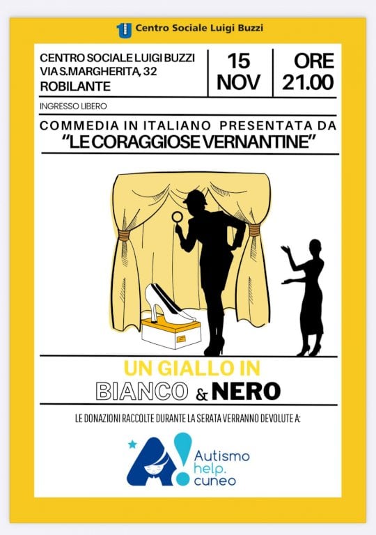 Il prossimo 15 novembre alle ore 21 lo spettacolo "Un giallo in bianco e nero" al Centro Sociale BuzziIl prossimo 15 novembre alle ore 21 “Le coraggiose vernantine” porteranno sul palco a Robilante il loro spettacolo “Un giallo in bianco e nero”. La commedia in due atti, scritta e interpretata dalla compagna tutta al femminile, andrà in scena al Centro Sociale Buzzi in via Santa Margherita 32. L’ingresso sarà libero, le donazioni raccolte durante la serata saranno devolute all’associazione Autismo Help Cuneo.