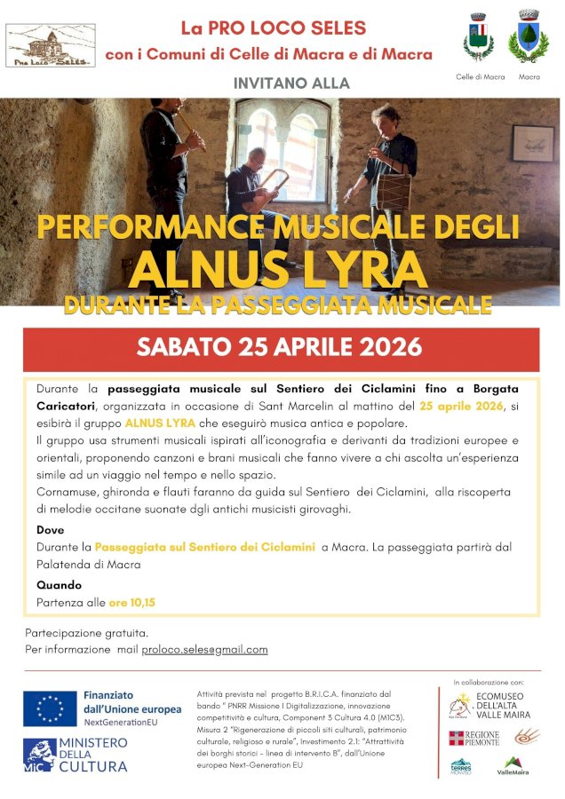 L’evento musicale sostenuto dai Comuni di Macra e Celle di Macra ed organizzato in collaborazione con la Pro loco Seles di Celle di Macra e l’Ecomuseo dell’Alta Valle Maira, rientra all’interno delle iniziative del Progetto B.RI.C.A.: Borghi Resilienti di Innovazione Culturale Ambientale finanziato a valere sul PNRR - Missione 1 –Component 3 – Cultura 4.0 (M1C3). Misura 2 “Rigenerazione di piccoli siti culturali, patrimonio culturale, religioso e rurale”, Investimento 2.1: “Attrattività dei borghi storici” – Linea intervento B.
