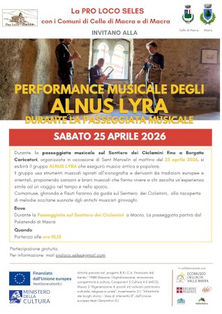 Appuntamento per il 25 aprile. La passeggiata avrà inizio alle ore 10.15 da Borgata Bedale. Partecipazione gratuitaSabato 25 aprile a Macra, durante la passeggiata musicale lungo il Sentiero dei Ciclamini verrà proposta la performance Musicale con il gruppo "Alnus Lyra" che eseguirà brani di musica antica e popolare.
