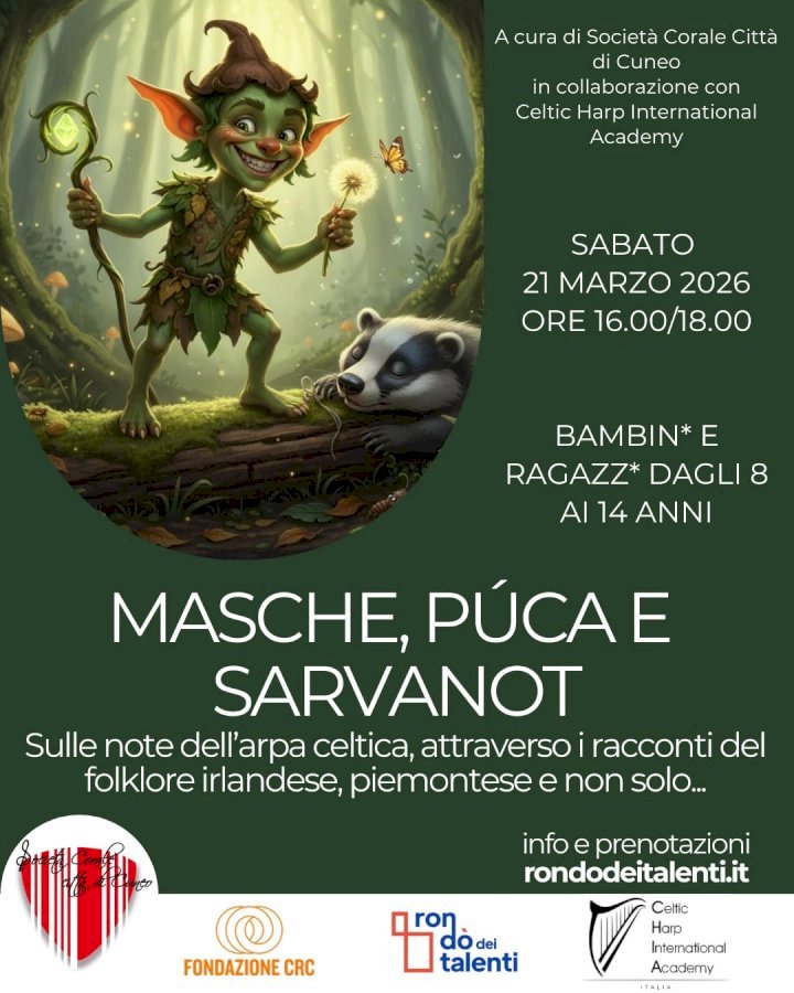 Un workshop per ragazzi dagli 8 ai 14 anni accompagnato dalle note dell’arpa celtica e dai racconti del folklore della tradizione irlandese, piemontese e non soloSabato 21 marzo dalle ore 16 alle 18 si svolgerà, presso il Rondò dei Talenti di Cuneo, il workshop Masche, Puca e Sarvanot, letterature comparate tra Irlanda, Piemonte e non solo.