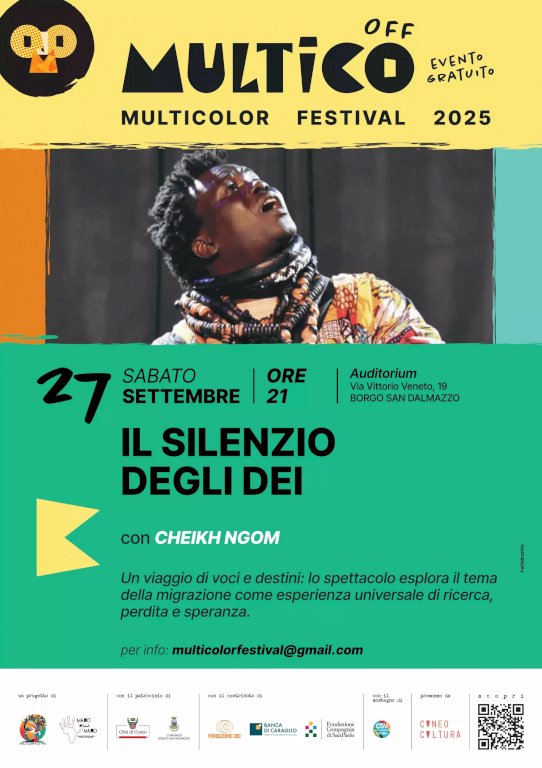In programma lo spettacolo "Il silenzio degli Dèi" con Cheikh Ngom, incentrato sul racconto di storie di confine e identitàMulticolor Festival è un evento che promuove l'arte come mezzo di dialogo e trasformazione sociale. La manifestazione, dedicata alla celebrazione della diversità culturali, offre uno spazio di condivisione dove musica, danza, teatro, illustrazione e tradizioni possano parlarsi e arricchirsi a vicenda. L’arte, in questo contesto, diventa il filo conduttore che unisce storie, sogni e identità, superando barriere e pregiudizi.