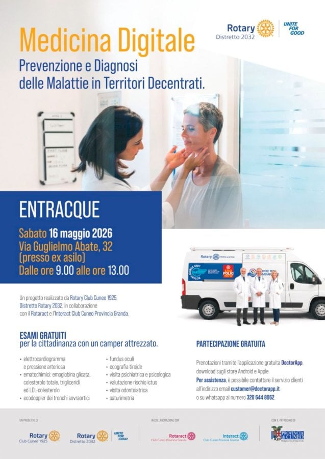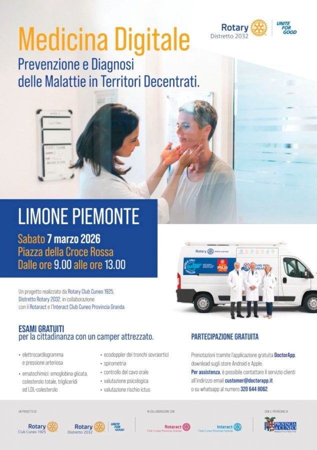 Il progetto ha ottenuto il patrocinio della Provincia di Cuneo e nasce con l’obiettivo di portare servizi gratuiti di prevenzione e diagnostica specialistica nei Comuni montani e nei territori più decentrati, dove l’accesso alle cure può risultare più complesso. Le prestazioni saranno offerte gratuitamente dai medici specialisti soci del Rotary Club Cuneo 1925.