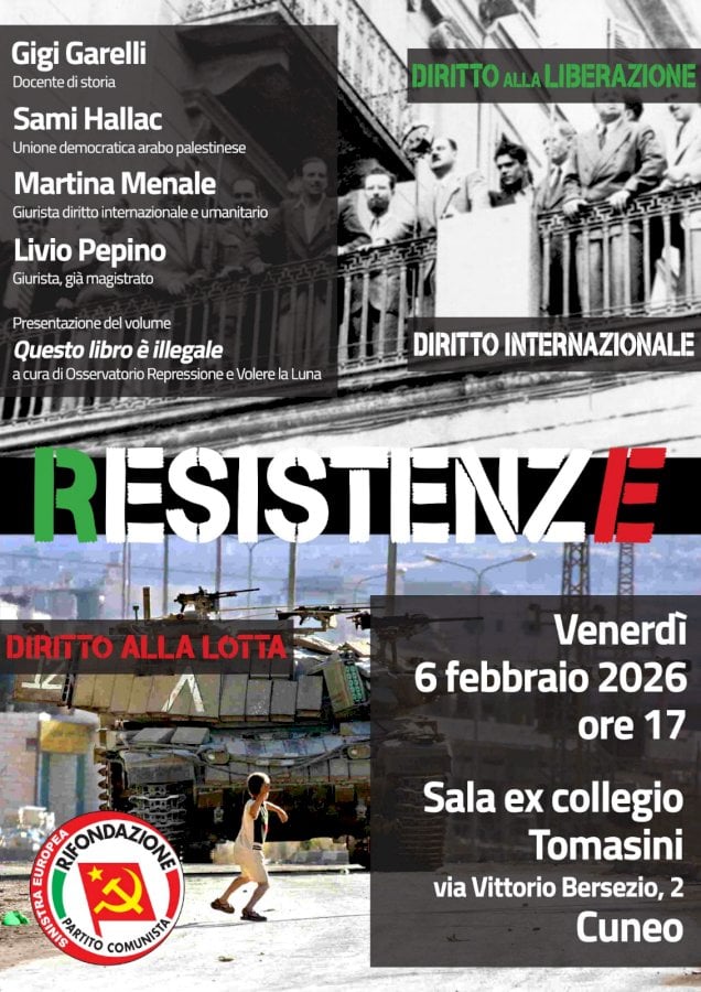 Sarà l'ex collegio dei Tomasini di Cuneo a ospitare l'incontro. A margine dell'evento sarà presentato il volume "Questo libro è illegale"Venerdì 6 febbraio 2026, alle ore 17, presso la Sala ex collegio Tomasini di Cuneo (via Vittorio Bersezio, 2), si terrà un'iniziativa pubblica avente come titolo la parola Resistenze. L'evento mira a mettere a confronto e discutere il concetto di resistenza in situazioni e contesti storico-politici diversi, esplorando l’attualità e la legittimità delle diverse forme di opposizione e liberazione, analizzando le varie implicazioni nel diritto internazionale.