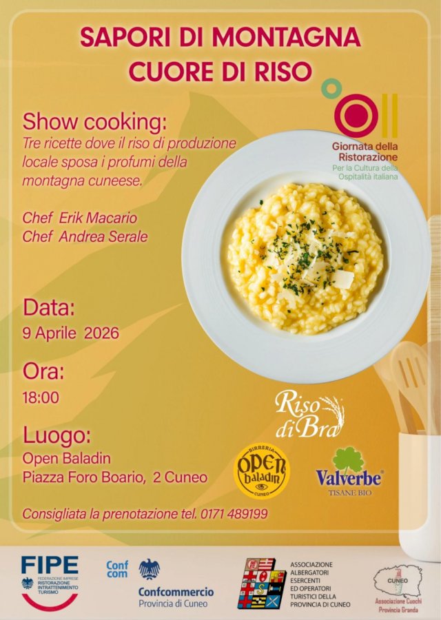 Nasce così “Sapori di Montagna - Cuore di Riso”, lo show cooking in programma giovedì 9 aprile alle ore 18 presso Open Baladin a Cuneo, promosso dall’associazione Albergatori Esercenti ed Operatori Turistici della Provincia di Cuneo, Confcommercio Provincia di Cuneo e associazione Cuochi Provincia Granda, in collaborazione con i produttori locali, Valverbe Tisane Bio e Riso di Bra di Allocco Giovanni.