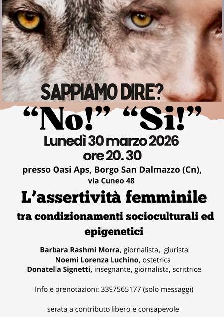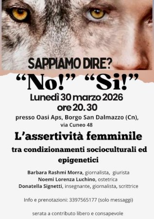 A Borgo San Dalmazzo il 30 marzo un incontro dedicato al tema del consenso, facendo riferimento alle capacità delle donne di riconoscere i propri bisogniLunedì 30 marzo alle ore 20.30, presso Oasi APS (via Cuneo 48), si terrà un incontro pubblico dal titolo “Sappiamo dire? ‘No!’ ‘Sì!’ – L’assertività femminile tra condizionamenti socioculturali ed epigenetici”.