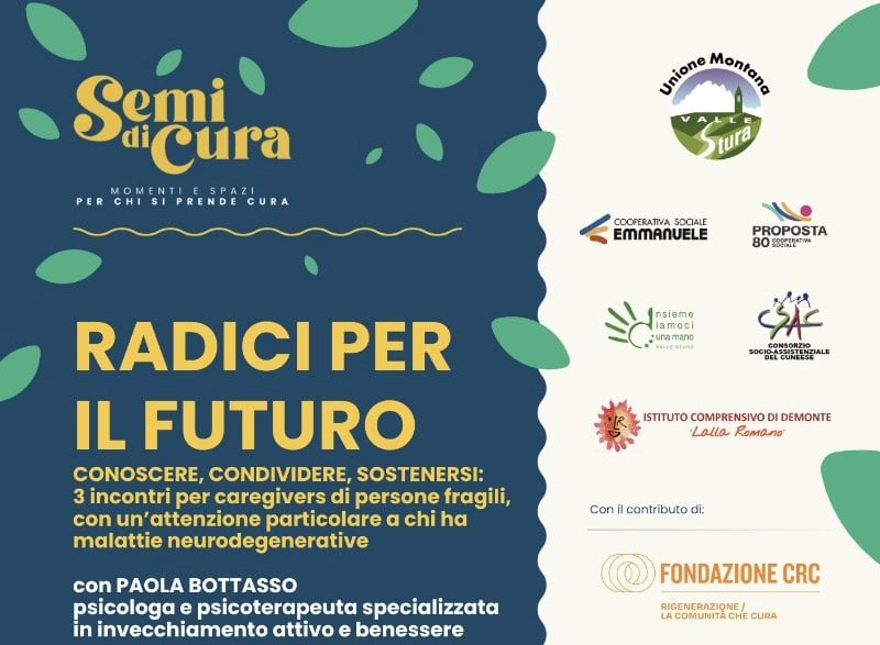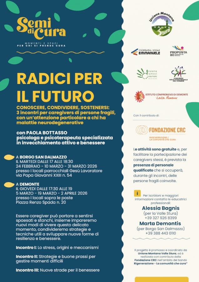 Gli incontri con la psicologa e psicoterapeuta si svolgeranno sia a Demonte che a Borgo San Dalmazzo, entrambi in tre dateA febbraio partiranno le prime iniziative del progetto “Semi di cura”, finanziato dal bando CRC “Rigenerazione la comunità che cura. Si tratta di tre incontri rivolti a caregivers di persone fragili, con particolare attenzione a chi ha malattie neurodegenerative. Le sessioni saranno tenute dalla dottoressa Paola Bottasso, psicologa e psicoterapeuta specializzata in invecchiamento attivo e benessere.
