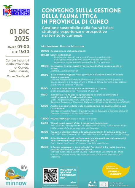 Il 1° dicembre al Centro Incontri della Provincia istituzioni, esperti e associazioni a confronto su tutela, ricerca e prospettive future delle acque interneIl 1° dicembre 2025, presso il Centro Incontri della Provincia di Cuneo (Sala Einaudi, Corso Dante 41), si terrà un importante convegno dedicato alla gestione sostenibile della fauna ittica nel territorio cuneese.