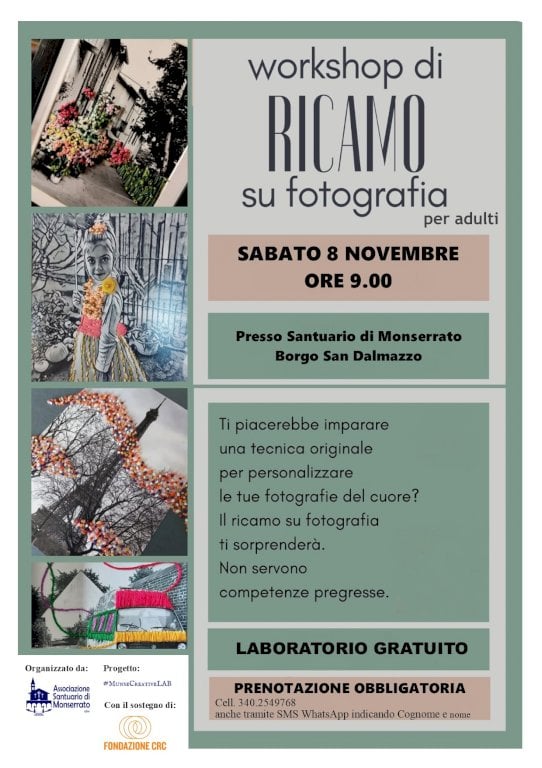 Sabato 8 novembre al Santuario di Monserrato Chiara Tarditi di Zest in the Attic condurrà i partecipanti alla scoperta delle basi dell’arte dell’ago e filoSabato 8 novembre, alle ore 9, presso il Santuario di Monserrato a Borgo San Dalmazzo, si terrà un workshop di ricamo su carta dedicato agli adulti. Non è richiesta alcuna esperienza: il laboratorio partirà dalle basi e tutto il materiale sarà fornito. L’incontro, gratuito, sarà condotto da Chiara Tarditi di Zest in the Attic e offrirà un momento di creatività e condivisione.
