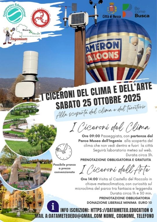 Sabato 25 ottobre sono state organizzate delle speciali visite, al Parco Museo dell’Ingenio e al Castello del Roccolo, per scoprire alcune curiosità del territorioSabato 25 ottobre a Busca si potranno scoprire il clima e il territorio della città come non lo hai mai visto, con un occhio all'arte, insieme a Datameteo Educational.