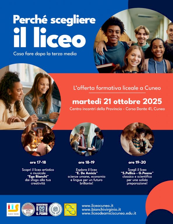 Per accompagnare le famiglie che dovranno scegliere dove iscriversi il prossimo anno è stata ideata una nuova iniziativa di orientamento che mette insieme i tre Licei della città di Cuneo: “Ego Bianchi”, con gli indirizzi artistico e musicale, “De Amicis”, dove si trovano gli indirizzi delle scienze umane, economico-sociale e linguistico, e “Pellico-Peano”, sede degli indirizzi classico e scientifico. In quest'ordine si presenteranno presso il Centro Incontri della Provincia di Cuneo (corso Dante 41) martedì 21 ottobre, a partire dalle ore 17 e fino alle 20.