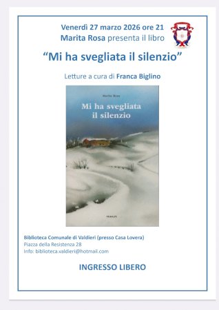 Appuntamento presso la Biblioteca Comunale alle ore 21. Ingresso liberoLa Biblioteca Comunale di Valdieri protagonista con la presentazione del libro di Mara Fiorito "Mi ha svegliata il silenzio". L'incontro si terrà il 27 marzo alle 21. Ingresso libero e gratuito