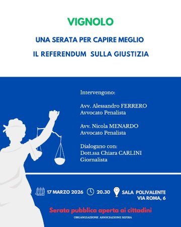 La Sala Polivalente, in via Roma 6, ospiterà un incontro pubblico per capire davvero cosa cambia con la Riforma NordioQuesta sera, martedì 17 marzo alle 20.30, presso la Sala Polivalente di Vignolo (Via Roma 6), comune a pochi chilometri da Cuneo, si terrà un incontro pubblico dedicato a comprendere in modo chiaro e accessibile i contenuti del Referendum sulla Giustizia del prossimo 22 e 23 marzo.
