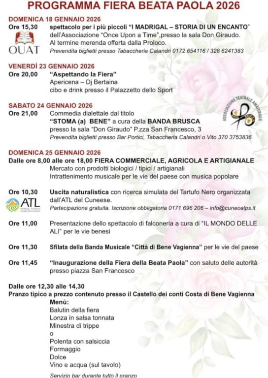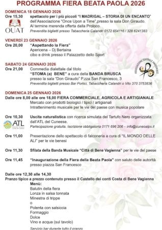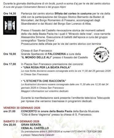 Domenica 25 gennaio le vie del paese verranno animate dalla tradizionale sfilata in costume, dal mercato e dallo spettacolo di falconeria e rievocazioneDomenica 25 gennaio a Bene Vagienna appuntamento con le celebrazioni in onore della “Signora di Bene”: la Beata Paola Gambara Costa. Il suggestivo centro storico sarà animato dalla tradizionale sfilata in costume, dal mercato, dallo spettacolo di falconeria e dalla rievocazione dei momenti più significativi della sua vita, tra cui il celebre Miracolo delle Rose.