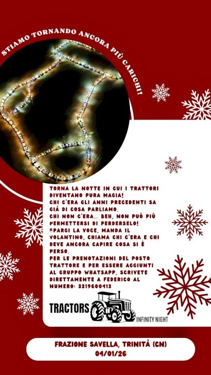 Decine di trattori si ritroveranno in frazione Savella di Trinità per creare una grande immagine luminosa. Il ricavato andrà alla Pediatria dell'ospedale di MondovìDopo il grande successo degli anni passati, torna con la sua terza edizione la “Tractors Infinity Night” di Trinità. Domenica 4 gennaio decine di trattori - l’anno scorso furono ben 214 - si ritroveranno in frazione Savella per creare una spettacolare e suggestiva immagine luminosa, ma soprattutto per fare del bene. I fondi raccolti durante l’evento, infatti, saranno interamente devoluti al reparto di Pediatria dell’ospedale di Mondovì.
