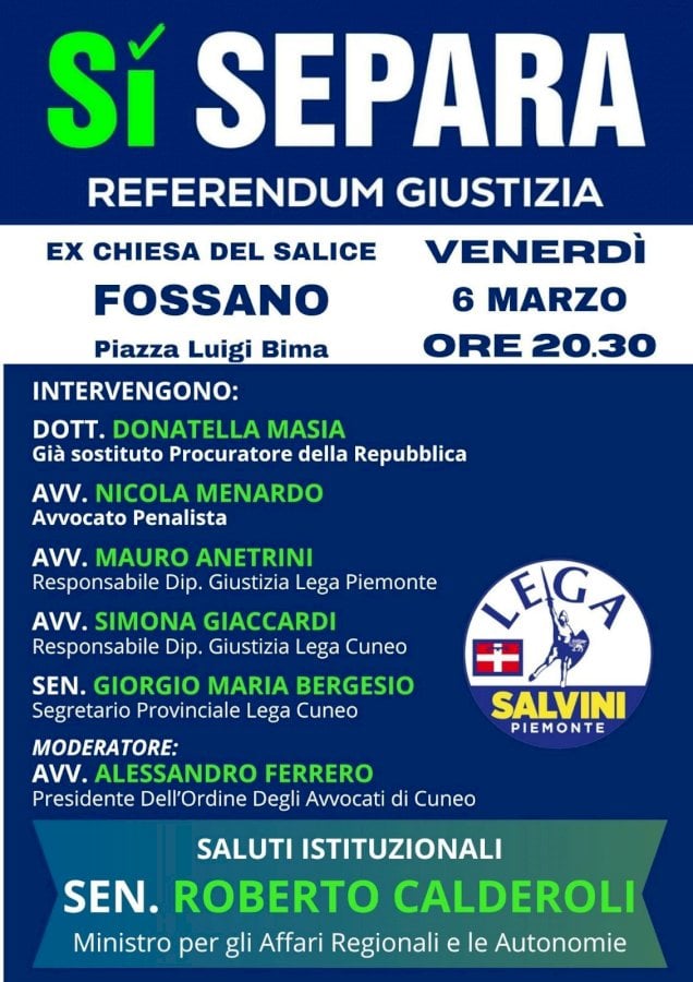 Il commento del senatore leghista Bergesio: "Siamo di fronte ad un momento di riflessione". L'incontro si terrà il 6 marzoLa sezione di Cuneo della Lega organizza a Fossano un importante momento di dibattito e confronto sul tema del Referendum sulla Giustizia. L’appuntamento è fissato per venerdì 6 marzo, alle 20.30, presso l'ex Chiesa del Salice in Piazza Luigi Bima a Fossano. L'incontro mira a informare e sensibilizzare la cittadinanza su un tema cruciale per il futuro del Paese: la riforma del sistema giudiziario.