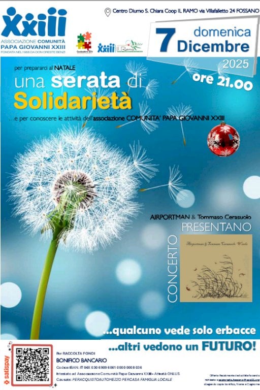 Evento benefico a Fossano per la Comunità Papa Giovanni XXIII, con testimonianze di rinascita e musiche di Airportman & Tommaso CerasuoloDomenica 7 dicembre, alle ore 21, evento di musica e solidarietà al Centro Diurno S. Chiara Coop Il Ramo (via Villafalletto 24, Fossano). I protagonisti saranno gli Airportman & Tommaso Cerasuolo e la Comunità Papa Giovanni XXIII in una serata di raccolta fondi per sostenere le case famiglia della provincia di Cuneo; una serata dove le testimonianze di rinascita e condivisione insieme alle cover contenute nell'album “Weeds” accenderanno lo spirito natalizio all'insegna di umanità e fratellanza perché ”dove qualcuno vede solo erbacce...altri vedono un futuro!”.