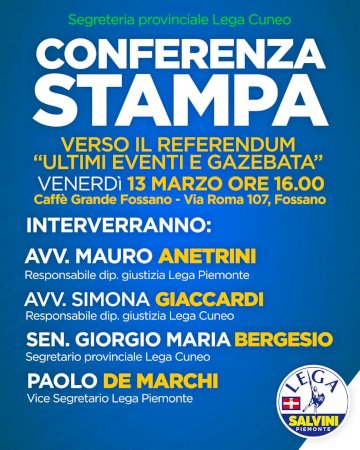 L'incontro si terrà presso il Caffè Grande, in via Roma 107. Sarà presente anche il senatore BergesioSi terrà venerdì 13 marzo alle ore 16, presso il Caffè Grande di Fossano (Via Roma 107), la conferenza stampa per la presentazione dell’iniziativa promossa dalla Segreteria provinciale della Lega di Cuneo: “Verso il referendum – Ultimi eventi e gazebata”.