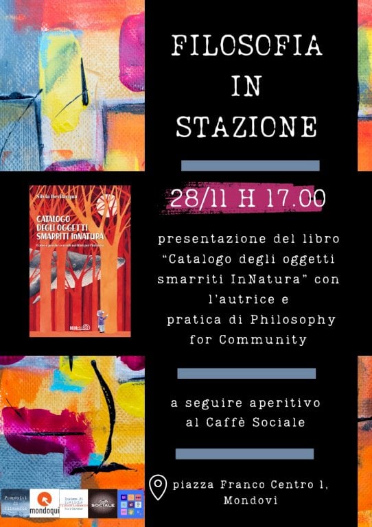 A dare il via agli incontri il 28 novembre la presentazione del libro di Silvia Bevilacqua “Catalogo degli oggetti smarriti InNatura. Come e perché cercarli nei libri per l'infanzia”Al Caffè Sociale di Mondovì ripartono gli incontri di “Filosofia in Stazione – Philosophy for Community”, momenti in cui fermarsi, dialogare e pensare insieme, scoprendo il piacere del confronto e del pensiero condiviso. Venerdì 28 novembre, alle ore 17, si terrà la presentazione del libro “Catalogo degli oggetti smarriti InNatura. Come e perché cercarli nei libri per l'infanzia” (ed. Mimesis) con l’autrice Silvia Bevilacqua. Un libro rivolto a insegnanti, educatori, genitori e a chiunque abbia a cuore il presente, e di conseguenza il futuro, della terra ricercando e riscoprendo il legame smarrito con la natura nelle parole di autori e autrici per l'infanzia. A seguire, tra le 18 e le 19, si svolgerà la pratica di Filosofia di comunità. Infine, per chi vorrà fermarsi, il pomeriggio si concluderà con un aperitivo per continuare il dialogo in un clima informale e accogliente.
