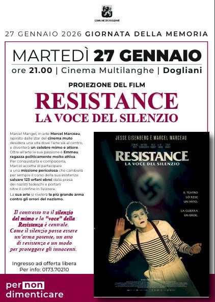 Appuntamento previsto per il 27 gennaio alle ore 21, dedicato alla storia di Marcel Marceau e alla sua attività nella Resistenza franceseIl Comune di Dogliani – in occasione della Giornata della Memoria – propone come occasione di ricordo e di riflessione la proiezione del film “Resistance. La voce del silenzio”, martedì 27 gennaio alle ore 21 presso il Cinema Multilanghe.