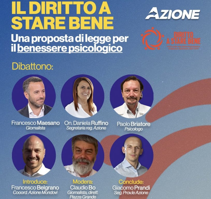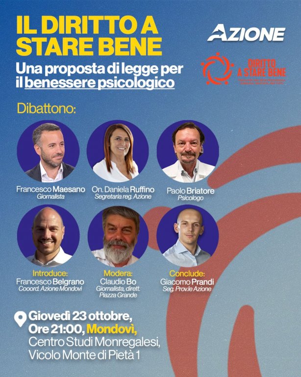 L'iniziativa, promossa dal coordinamento cittadino di Azione Mondovì, mira a porre le basi per un sistema di supporto psicologico accessibile a tutti i cittadini, riconoscendo l'importanza cruciale della salute mentale nella vita quotidiana. Francesco Belgrano, Coordinatore Cittadino Azione Mondovì, che introdurrà l'evento, sottolinea l'importanza di questa discussione: "Siamo convinti che il diritto a stare bene debba essere un pilastro della nostra società. Questa proposta di legge è un passo fondamentale per garantire un supporto psicologico adeguato a chiunque ne abbia bisogno, e siamo lieti di ospitare un dibattito così rilevante nel Monregalese".