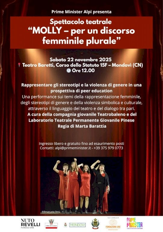 Da Cenerentola a Penelope, dalle streghe del Macbeth a Barbie: il 22 novembre ci si interroga sugli stereotipi e la violenza di genere attraverso figure e immaginari femminiliNella giornata di sabato 22 novembre alle ore 12, presso il Teatro Baretti di Mondovì, corso dello Statuto 15F, si terrà lo spettacolo teatrale “Molly – per un discorso femminile plurale”, a cura della compagnia giovanile Teatrobaleno e del Laboratorio Teatrale Permanente Giovanile Pinese, con la regia di Marta Barattia realizzato con il sostegno della Fondazione CRC, nell’ambito del Bando Impegnati nei diritti 2025. La performance, ideata e scritta da giovani per i giovani, propone un percorso corale e partecipato che attraversa figure e immaginari femminili, da Cenerentola a Penelope, dalle streghe del Macbeth a Barbie per interrogarsi su linguaggio, rispetto, violenza simbolica e culturale, ruoli sociali e discriminazioni ancora presenti. Attraverso parole, suoni e gesti collettivi, la messa in scena invita a riflettere su temi quali il carico mentale, i canoni estetici, la violenza di genere e la costruzione di un linguaggio più inclusivo.