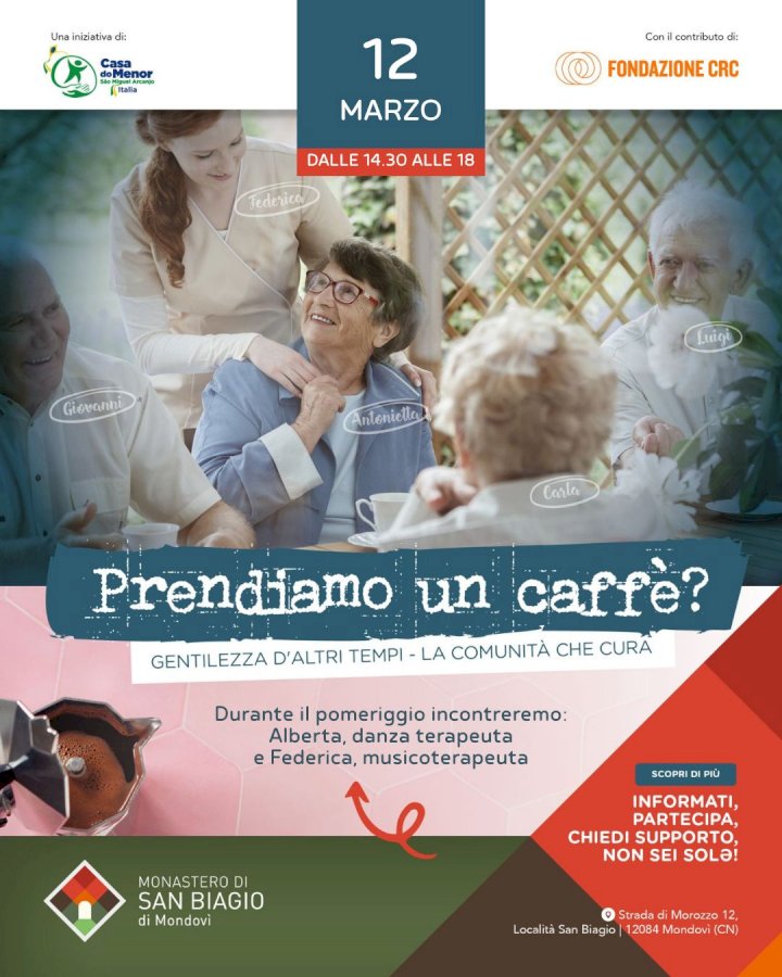 L'incontro si terrà il 15 marzo dalle 14.30 fino alle 17.30: un pomeriggio di creatività e condivisione per le persone over 65Giovedì 12 marzo (14.30–17.30) al Monastero di San Biagio torna “Prendiamo un caffè?", un pomeriggio di movimento, creatività e condivisione per persone over 65, con merenda finale. Un invito semplice, ma prezioso: prendersi un pomeriggio per sé, incontrare nuove persone, muovere il corpo con dolcezza e lasciarsi sorprendere dal piacere di creare, senza giudizio e senza fretta.