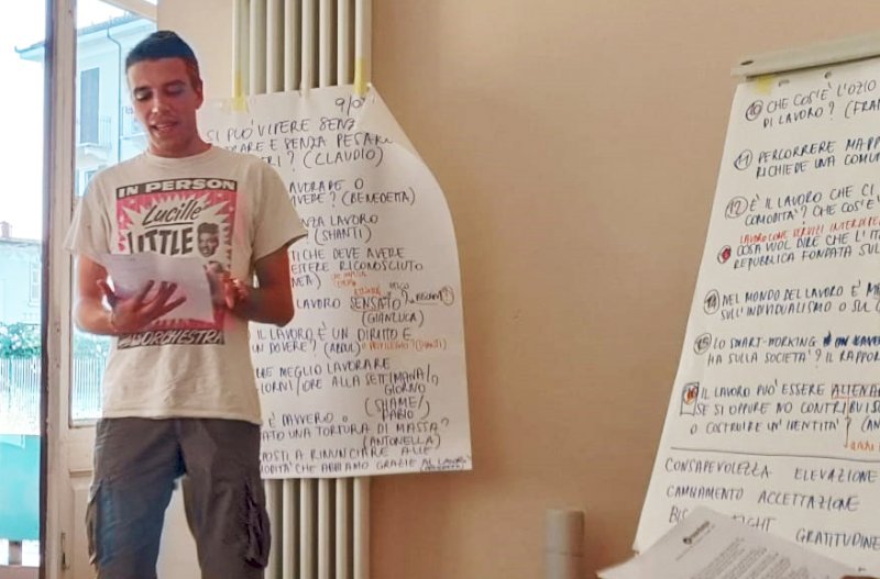 Ottima riuscita dell’incontro di Filosofia di comunità domenica, insieme all’artista e a persone di tutte le etàVenerdì 14 luglio, la Stazione di Mondovì si trasformerà in una location magica per l’esibizione live di Shame all’aperto. Dopo l’aperitivo al “Caffè Sociale” alle 19,30, il rapper si esibirà a partire dalle 20.30 in una piazza Franco Centro appositamente allestita. Domenica pomeriggio, l’artista Shame, iscritto al Guinnes World Record per aver improvvisato versi di freestyle in rima per 35 ore consecutive, ha partecipato ad uno degli incontri di “Filosofia in stazione” organizzati da MondoQui e tenuti da giovani filosofi, questa volta Miriana Turco e Gianluca Cavallo. I testi su cui si è lavorato e discusso sono stati “Controcorrente”, un brano dello stesso Shame (a sua volta laureato in filosofia) e un testo tratto da “Ma chi me lo fa fare? Come il lavoro ci ha illuso: la fine dell'incantesimo”, un libro di A. Colamedici e M. Gancitano. Trenta persone di ogni età e provenienza hanno dibattuto per due ore sul tema del lavoro e davvero il metodo della Filosofia di comunità, che punta a sviluppare idee, maturare intuizioni, farsi domande, crescere e formarsi come singoli e come gruppo, è stato ampiamente messo in pratica. La doppia iniziativa fa parte del progetto IN - Luoghi in crescita, sostenuto dalla Regione Piemonte e dai Comuni di Mondovì, Cuneo e Villanova M.vì e portato avanti dalla coop. Caracol insieme ad Asl CN1 e Consorzio dei Servizi Socio Assistenziali del Monregalese.