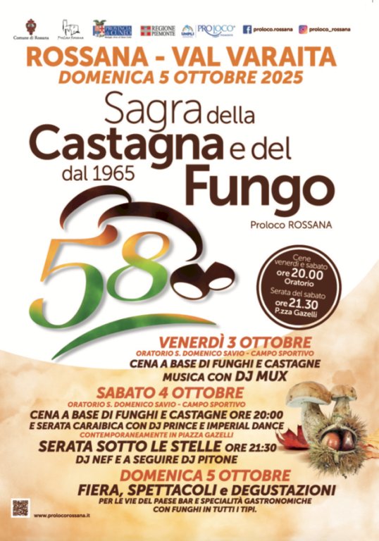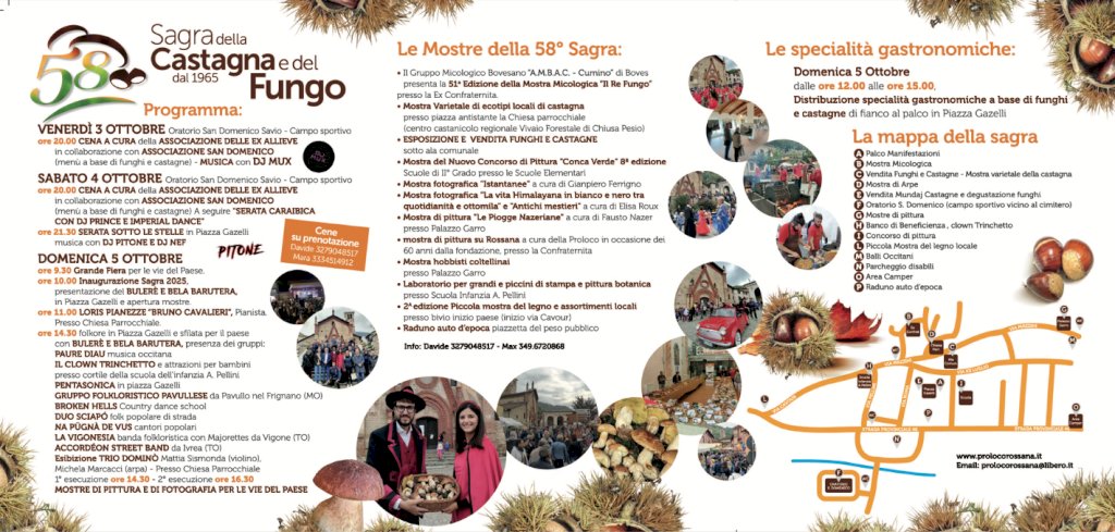 Giunta alla 58° edizione, la fiera invaderà le vie del paese con spettacoli, mostre d’arte, specialità gastronomiche e buona musicaLa tradizionale Sagra della Castagna e del Fungo, giunta alla sua 58° edizione, sta per arrivare a Rossana la prima domenica del mese di ottobre. La Proloco si è occupata anche quest’anno dell’organizzazione, proponendo un ricco calendario di eventi.
