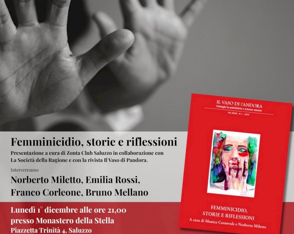 L’appuntamento, il 1 dicembre al Monastero della Stella, sarà occasione per riflettere sul fenomeno della violenza contro le donne e gli strumenti utili a contrastarloLunedì 1 dicembre, alle ore 21, il Monastero della Stella di Saluzzo (Piazzetta Trinità, 4) ospiterà una serata dedicata all’analisi del tema della violenza maschile contro le donne. L’occasione è la presentazione del nuovo numero monografico della rivista “Il Vaso di Pandora - dialoghi in psichiatria e scienze umane”, intitolato “Femminidicio, storie e riflessioni”.