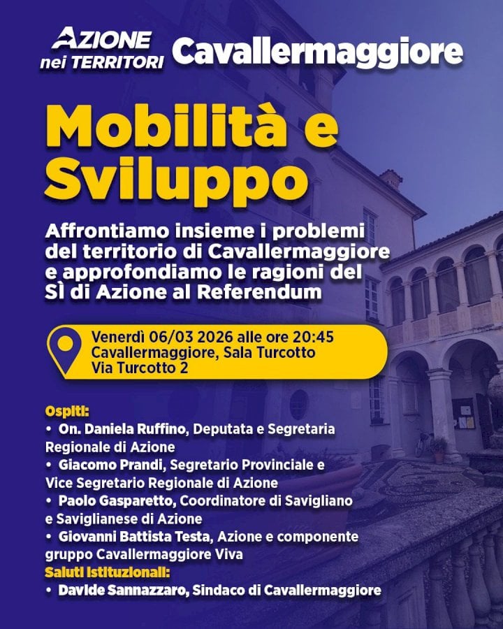 L’evento, che vedrà i saluti istituzionali del sindaco Davide Sannazzaro, vedrà la partecipazione di figure chiave del partito a livello nazionale e locale: l’onorevole Daniela Ruffino (deputata e segretaria regionale), Giacomo Prandi (segretario provinciale e vice segretario regionale), Paolo Gasparetto (coordinatore di Savigliano e Saviglianese di Azione) e Giovanni Battista Testa (Azione e componente del gruppo Cavallermaggiore Viva).